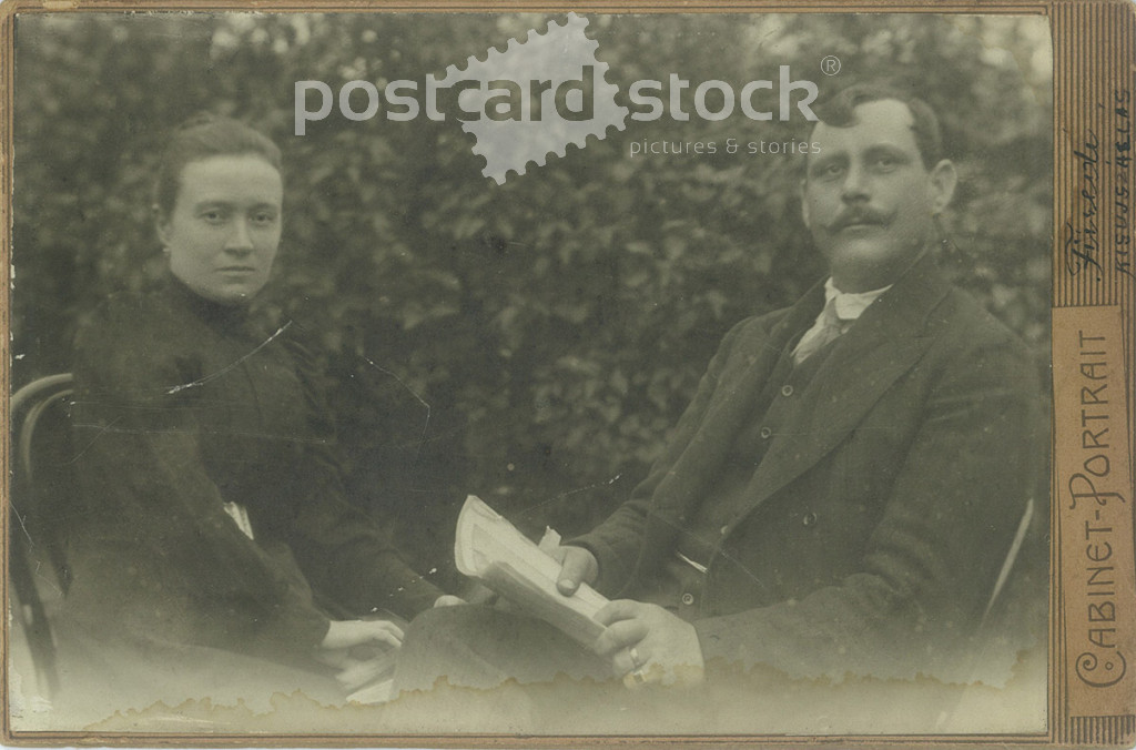 Cca 1900 - Fiatal pár fotója a kertben. A kép Füredi fotóműtermében, Kisújszálláson készült. Régi fotó. Eredeti kabinetfotó / keményhátú fotó / vizitkártya, CDV fotó. (2793769)