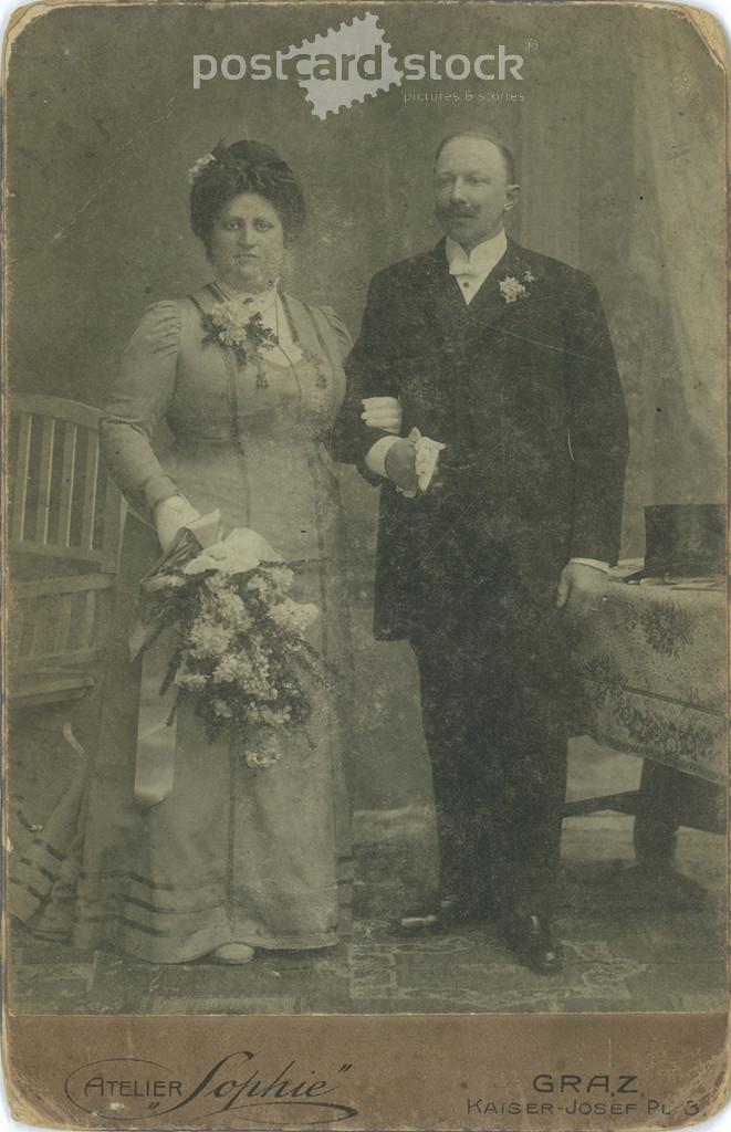 Cca 1900 - Előkelő pár műtermi fotója. A kép Sophie fotóműtermében, Grazban készült. Régi fotó. Eredeti kabinetfotó / keményhátú fotó / vizitkártya, CDV fotó. (2793770)