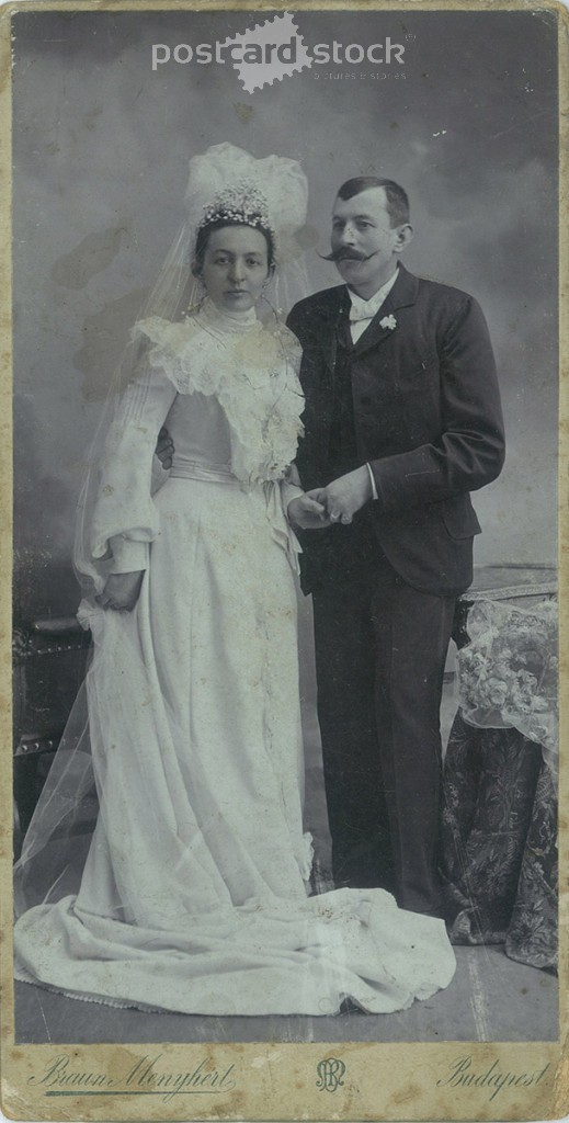 Cca 1900 - Esküvői pár fotója. A kép Braun Menyhért fotóműtermében, Budapesten készült. Régi fotó. Eredeti kabinetkártya / CDV fotó / keményhátú fotó. (2793791)